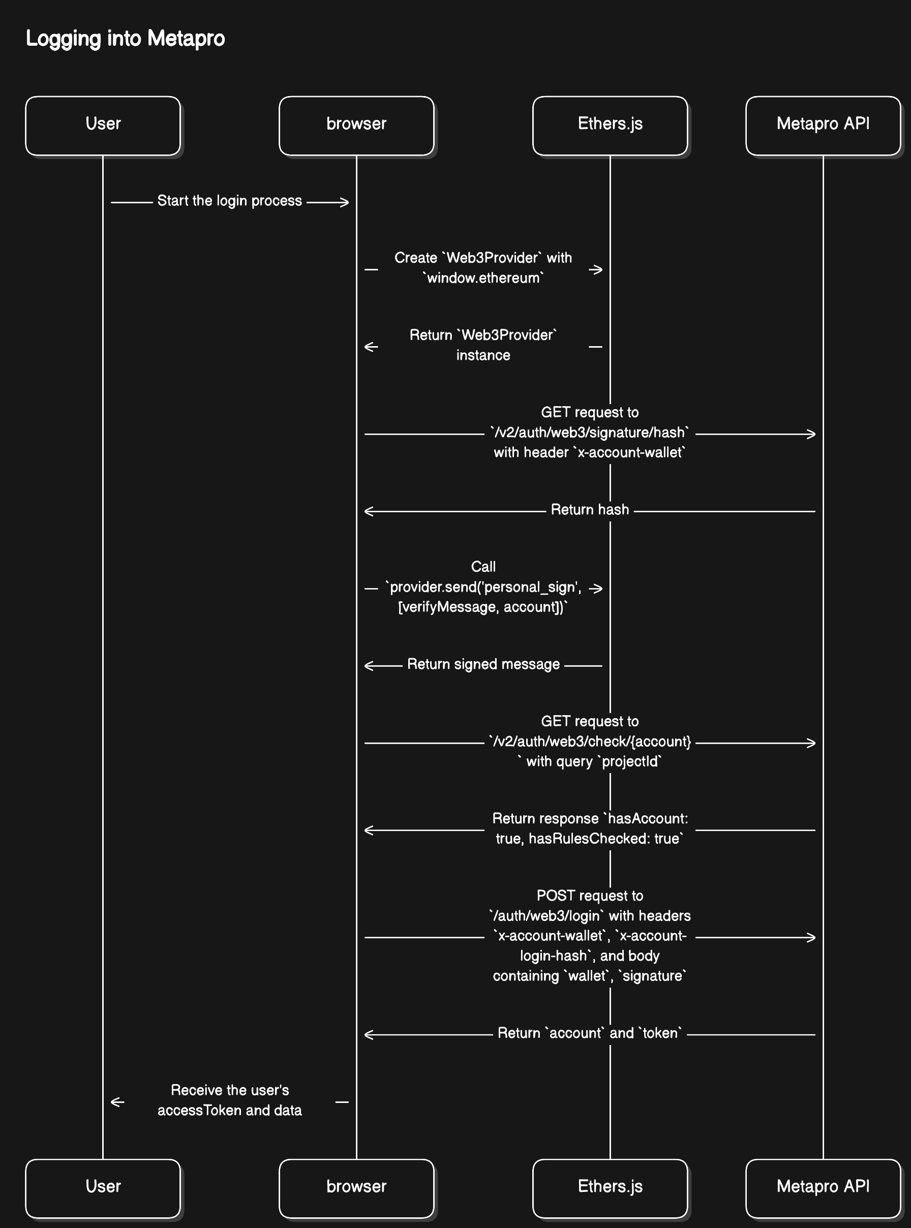 <figure><img src="https://2351247042-files.gitbook.io/~/files/v0/b/gitbook-x-prod.appspot.com/o/spaces%2F9QQIPimQeOGE3C1HbWxf%2Fuploads%2FnrXHWseCMcxvQ0zmKMeV%2Fimage.png?alt=media&#x26;token=aa533ecf-f4d7-4928-a51a-eff9d394dddc" alt=""><figcaption><p>The diagram shows an example of the user login process for metaproID using provider web3</p></figcaption></figure>