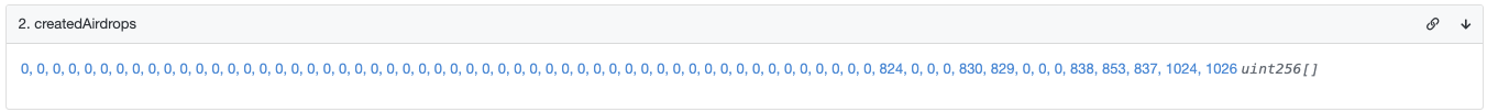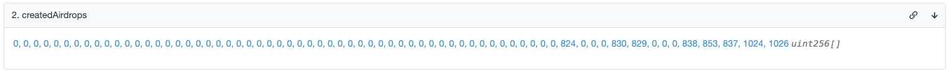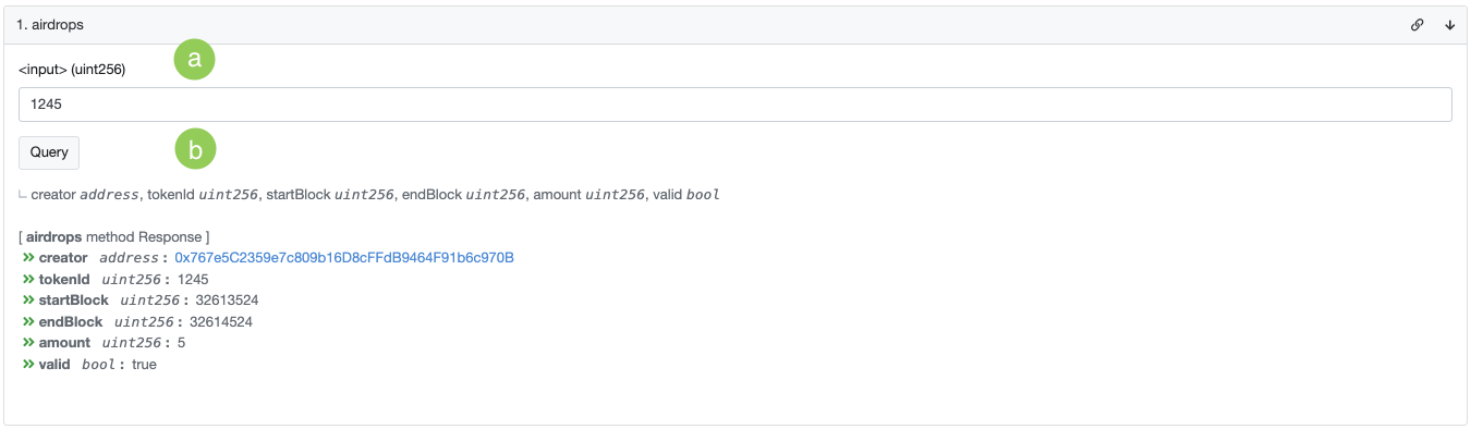 The airdrops method is responsible for returning information about a created airdrop. This method provides details about the airdrop's creator, the token ID associated with the airdrop, the starting block, the ending block, and the total quantity of tokens allocated for the airdrop.