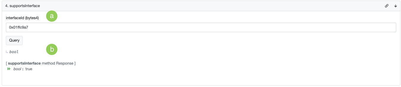 a. Input the interface ID (you can apply the same approach to support the ERC-165 (0x01ffc9a7) interface or other interfaces. Simply change the identifier according to the interface you want to check.)