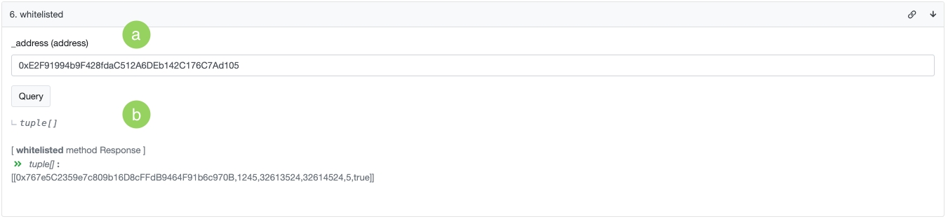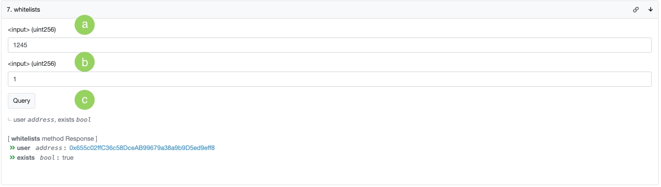 The whitelist method serves the purpose of identifying users (wallet addresses) who haven't yet claimed their tokens from the contract. This method is designed to assist in verifying which users still have pending tokens to claim. The method takes two parameters: the token ID and the index in the user array (if a user has claimed their token, they are automatically removed from the array).
