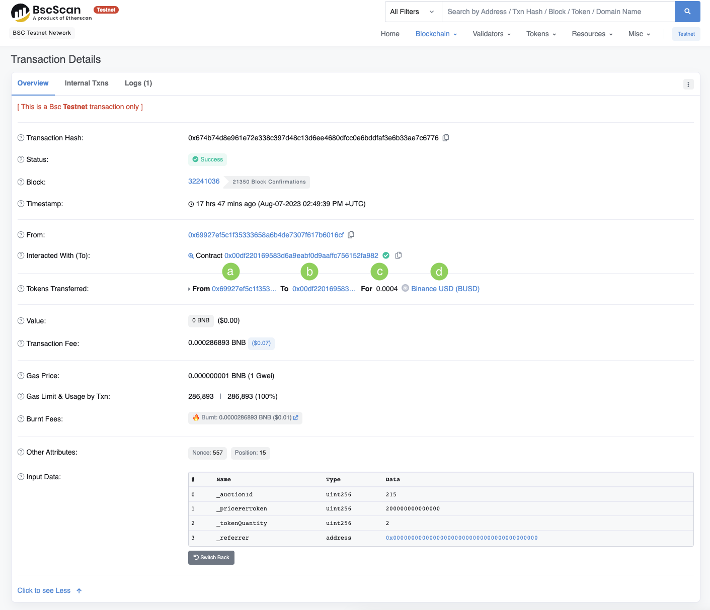 <table data-header-hidden><thead><tr><th width="177.33333333333331"></th><th width="309"></th><th></th></tr></thead><tbody><tr><td><strong>Data</strong></td><td><strong>Description</strong></td><td><strong>Restrictions</strong></td></tr><tr><td>_auctionId (uint256)</td><td>The unique identifier of the auction in which the user wants to place the bid.</td><td><ul><li>must be a number</li><li>must be a valid auction id</li></ul></td></tr><tr><td>_pricePerToken (uint256)</td><td>The price set for a single token, expressed in the units of the specified token (e.g., 0.0001 BUSD is represented as 1e14 in our case).</td><td><ul><li>must be a positive number</li><li>possible min price 0.0001 BUSD</li></ul></td></tr><tr><td>_tokenQuantity (uint256)</td><td>The number of tokens to be sent for the auction.</td><td><ul><li>cannot be 0</li><li>cannot be greater than owned tokens</li></ul></td></tr><tr><td>_referrer (address)</td><td>The address of the wallet from which we received the auction recommendation or the address of the person who registered us as an upline. If the user purchases the auction through a referral, the referrer will receive a commission from the transaction based on the agreed commission and referral level.</td><td><ul><li>must be a valid address</li></ul></td></tr></tbody></table>