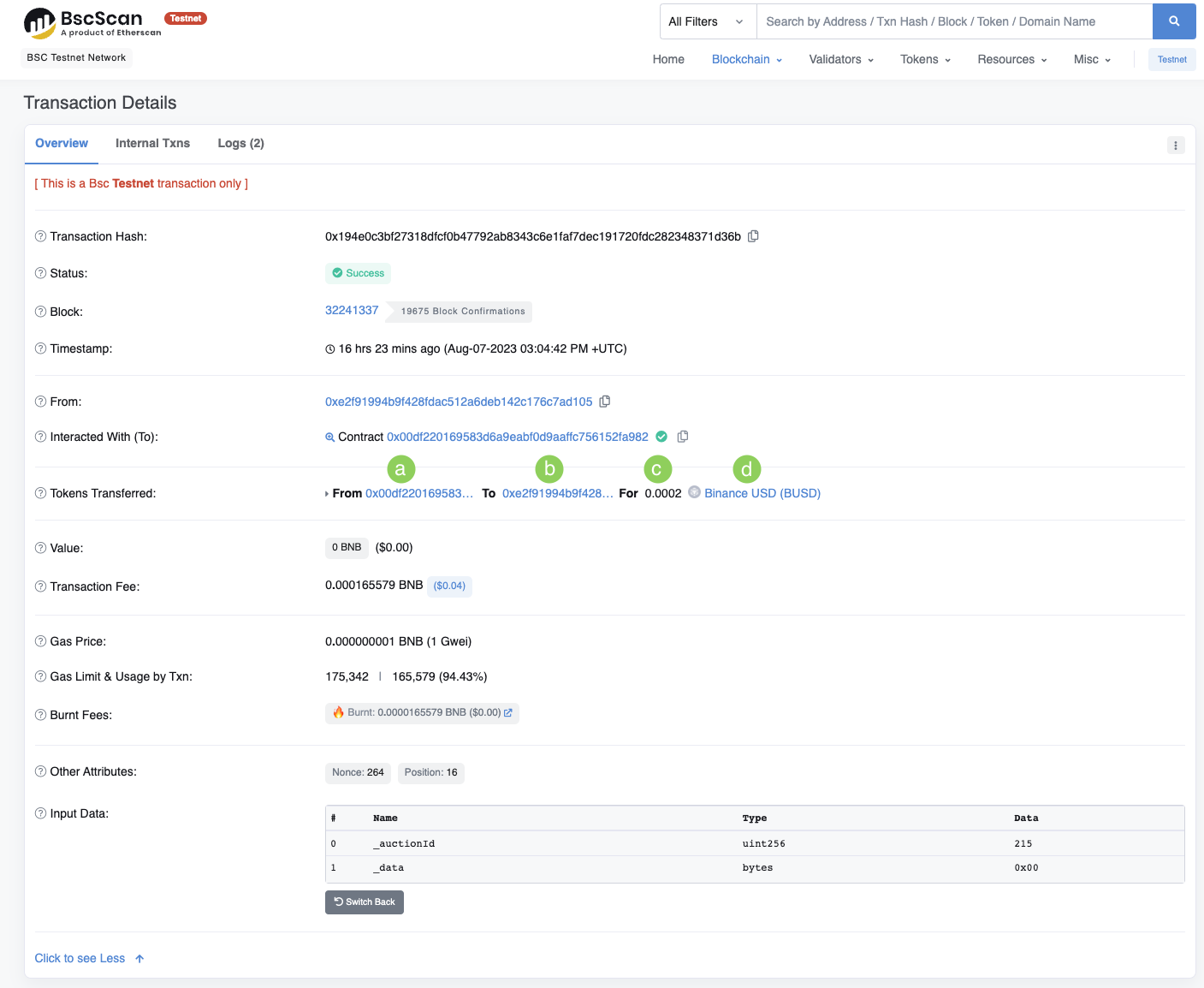 {% embed url="<https://testnet.bscscan.com/tx/0xd9309b0e83df04eb3484b52dafdc78faab74903a1b4257a17726bd915bb309d7>" %}