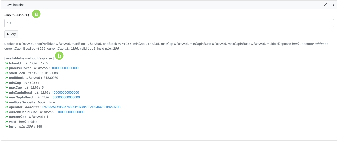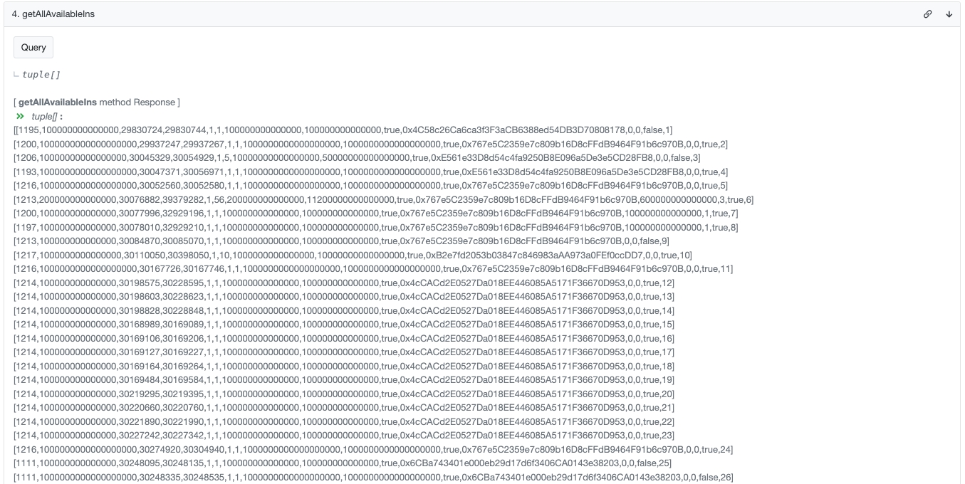 This method is responsible for returning an array containing [Token ID, token contract address] data indicating whether a specific INS Auction has been fully concluded. It checks whether all participants have already withdrawn tokens and funds from the contract.