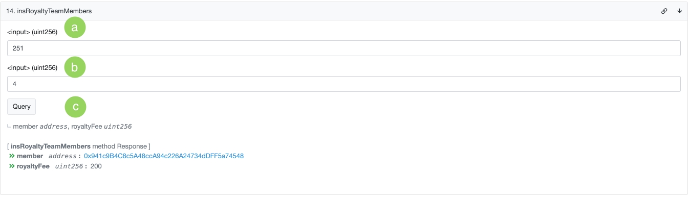 c. Return the member address and the member Royalty fee