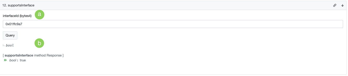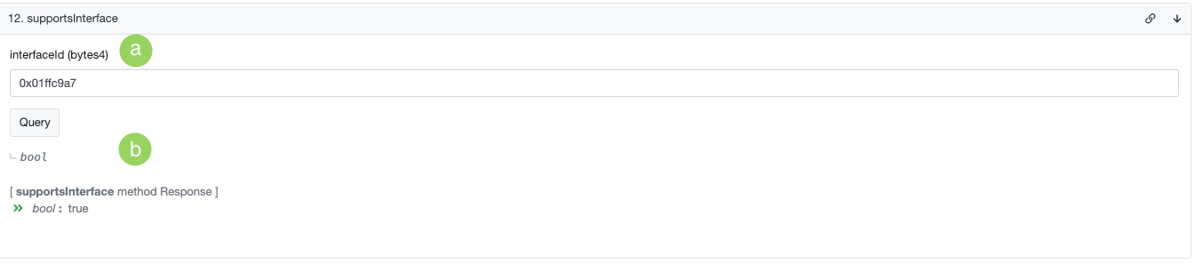 a. Input the interface ID (you can apply the same approach to support the ERC-165 (0x01ffc9a7) interface or other interfaces. Simply change the identifier according to the interface you want to check.)