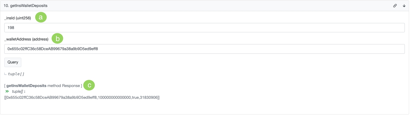 c. Returns an array structure [wallet address, CapInBusd, withdraw, block]