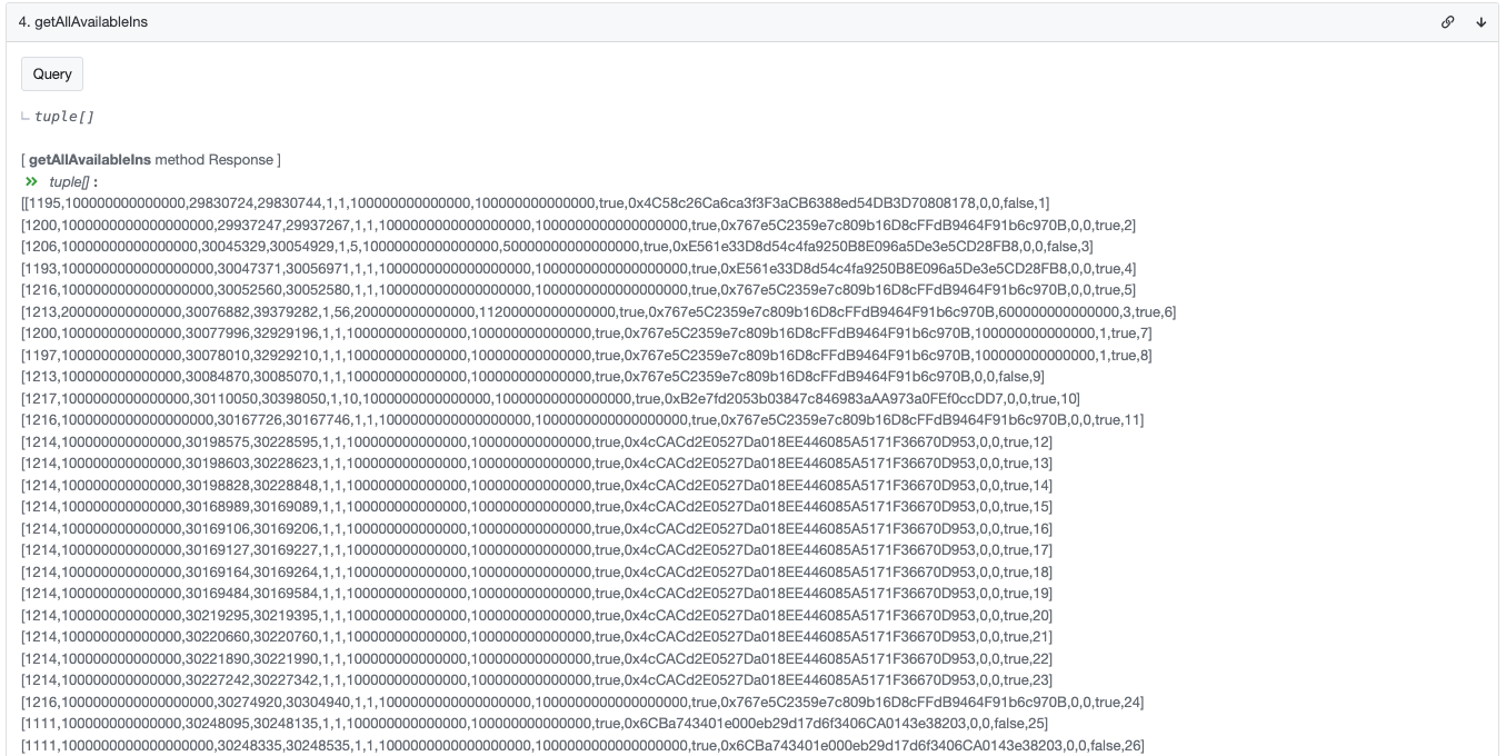 The method allows users to obtain a list of all token IDs that have been listed for sale in the auction. This method does not require any input parameters, as it retrieves information about all tokens listed for sale across all auctions. Users can use this information to see the complete list of tokens available for purchase and make informed decisions about their buying activities.**Returns an array of created auctions**\[TokenID, Price, StartBlock, EndBlock, MinCap, MaxCap, MinCapInBusd, MaxCapInBusd, MultipleDeposits, AuctionOperator, CurrentCapInBusd, CurrentCap, Valid, AuctionID]