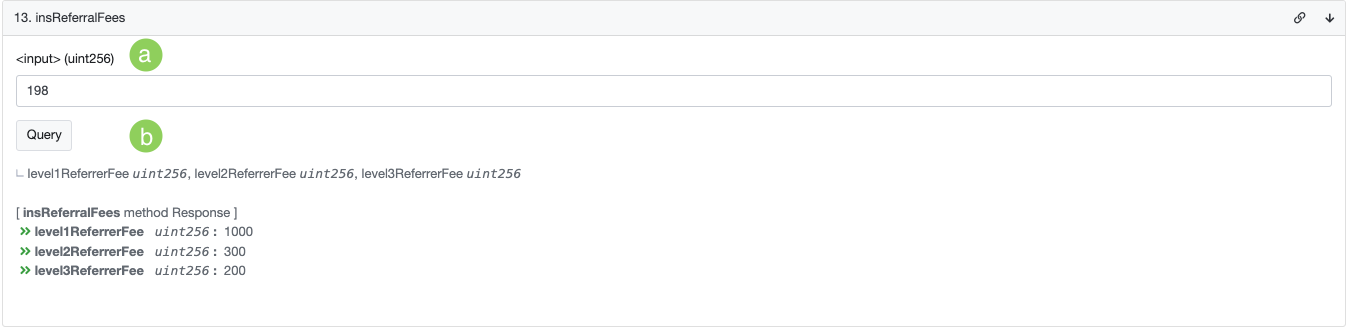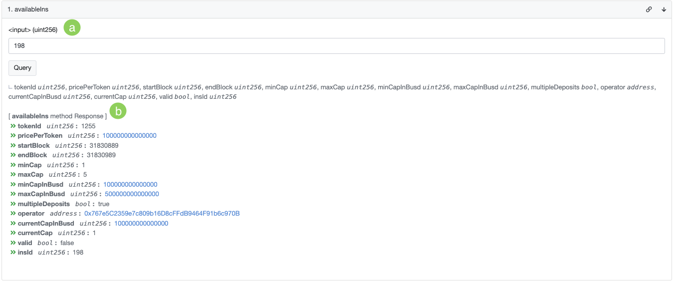 <table data-header-hidden><thead><tr><th width="206"></th><th></th></tr></thead><tbody><tr><td><strong>Data</strong></td><td><strong>Description</strong></td></tr><tr><td>&#x3C;input> (uint256)</td><td>The unique identifier of the INS auction.</td></tr><tr><td>&#x3C;input> (uint256)</td><td>The ID associated with the specific team member.</td></tr></tbody></table>