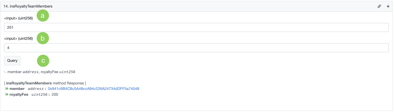 The insRoyaltyTeamMembers method returns the fee assigned to a specific team member of a given INS (Initial NFT Selling) auction. This information is obtained by providing the INS ID and the user's ID associated with the team member.