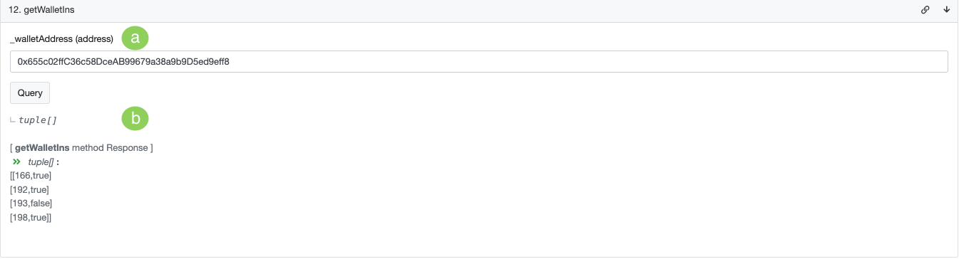 c. Returns an array structure \[wallet address, CapInBusd, withdraw, block]