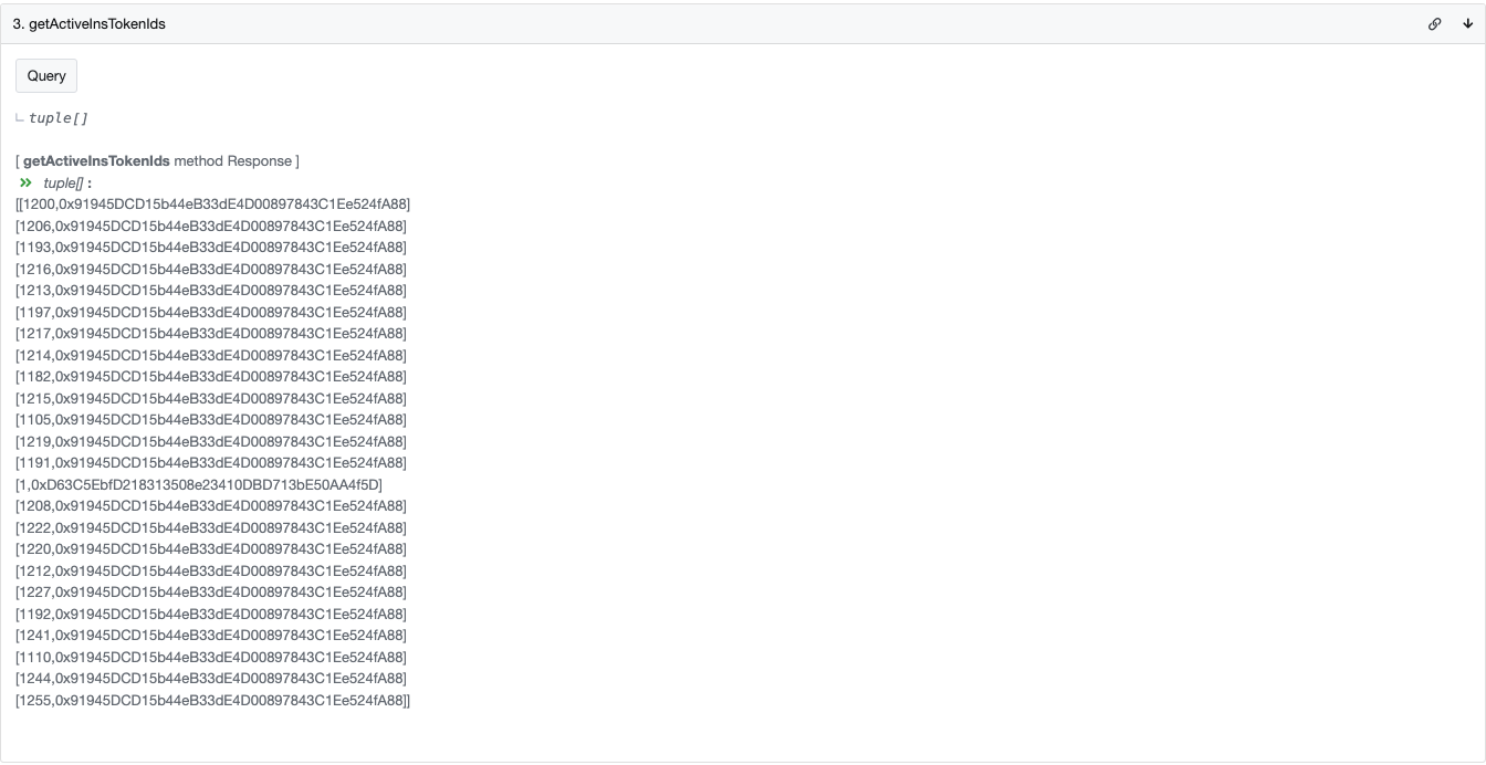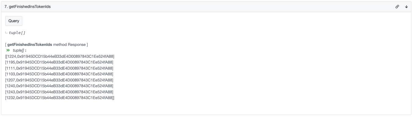This method is responsible for returning an array containing \[Token ID, token contract address] data indicating whether a specific INS Auction has been fully concluded. It checks whether all participants have already withdrawn tokens and funds from the contract.