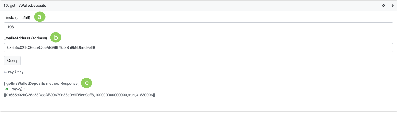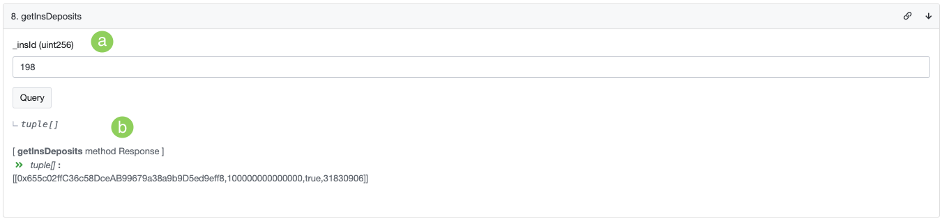 <table data-header-hidden><thead><tr><th width="168"></th><th></th></tr></thead><tbody><tr><td><strong>Data</strong></td><td><strong>Description</strong></td></tr><tr><td>insId (uint256)</td><td>The ID of the INS auction for which we want to retrieve deposit information.</td></tr></tbody></table>