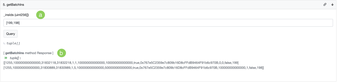 <table data-header-hidden><thead><tr><th width="195"></th><th></th></tr></thead><tbody><tr><td><strong>Data</strong></td><td><strong>Description</strong></td></tr><tr><td>insIds (uint256)</td><td>The array of auction IDs for which we want to retrieve information.</td></tr></tbody></table>