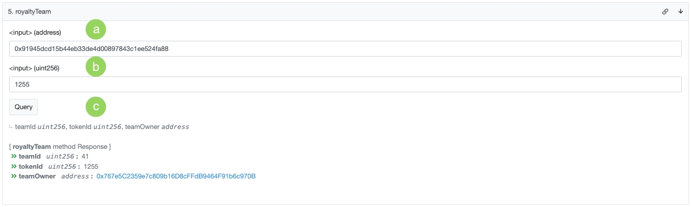 The royaltyTeam method is responsible for retrieving detailed information about a team, including the owner's address and the team's identifier. By providing specific parameters, users can access essential data related to a team, aiding in obtaining a comprehensive understanding of the given entity.