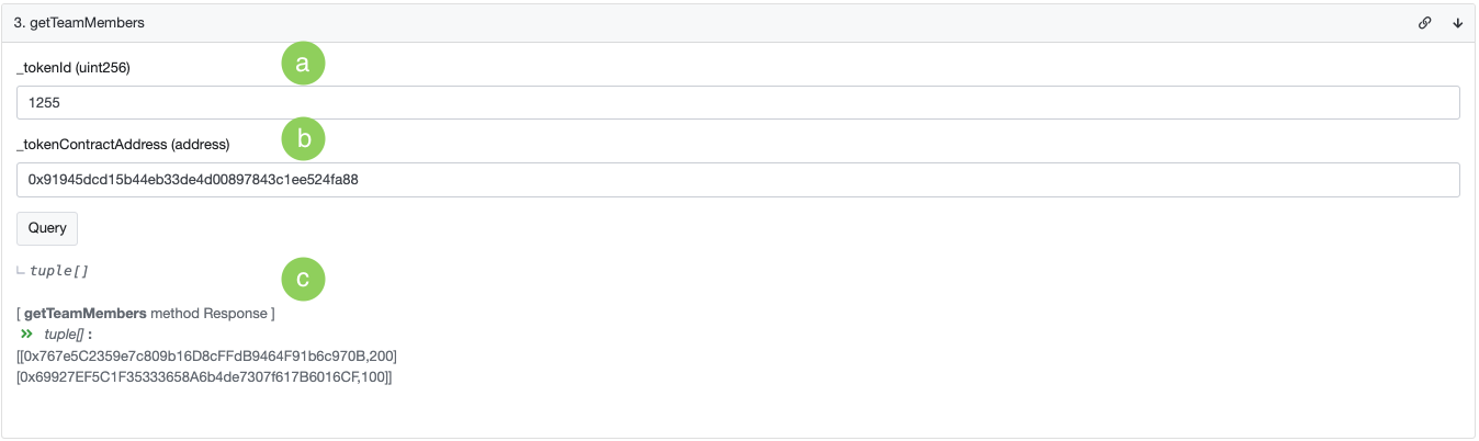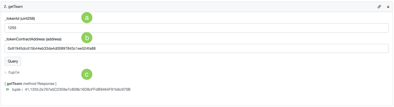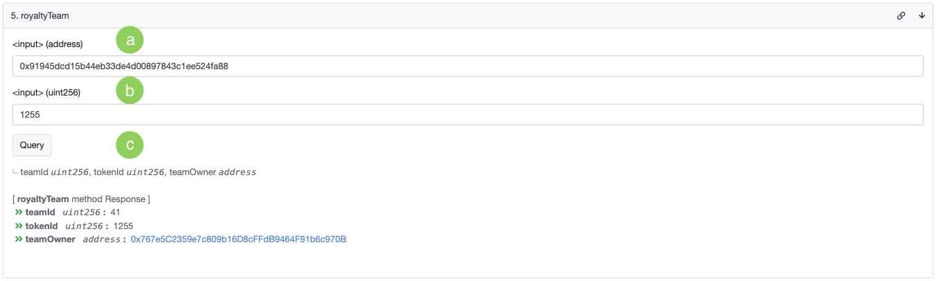 c. Response the teamId, tokenId, and teamOwner