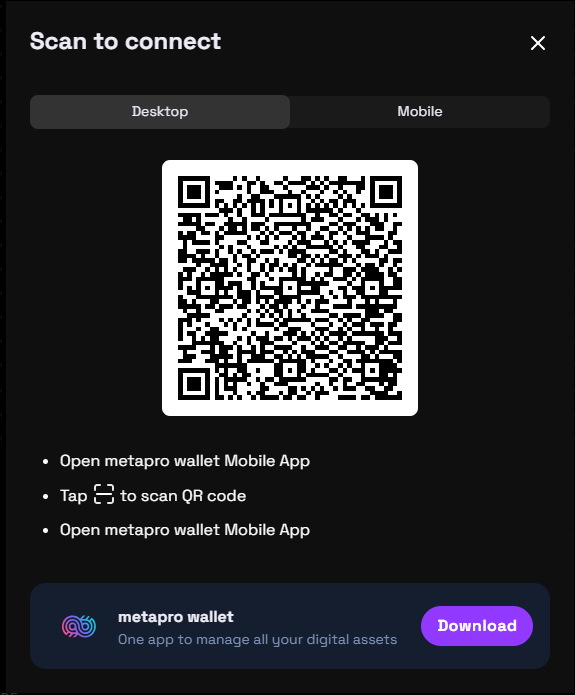 Open metapro wallet Mobile App on your phone and **scan QR code**. If you don’t have metapro wallet you can download it by clicking blue [D](https://www.metaprowallet.com/download)[ownload](https://wallet.metapro.one/) button on the site.&#x20;