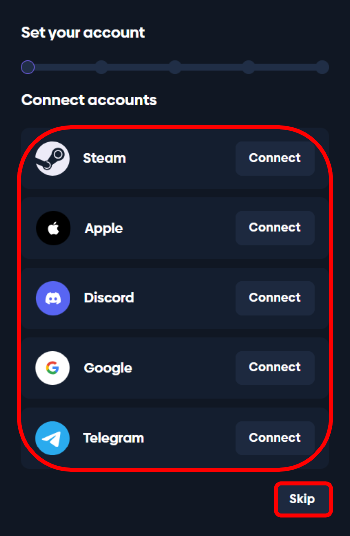 You can connect your account with your already existing Steam, Apple, Discord, Google or Telegram  account.