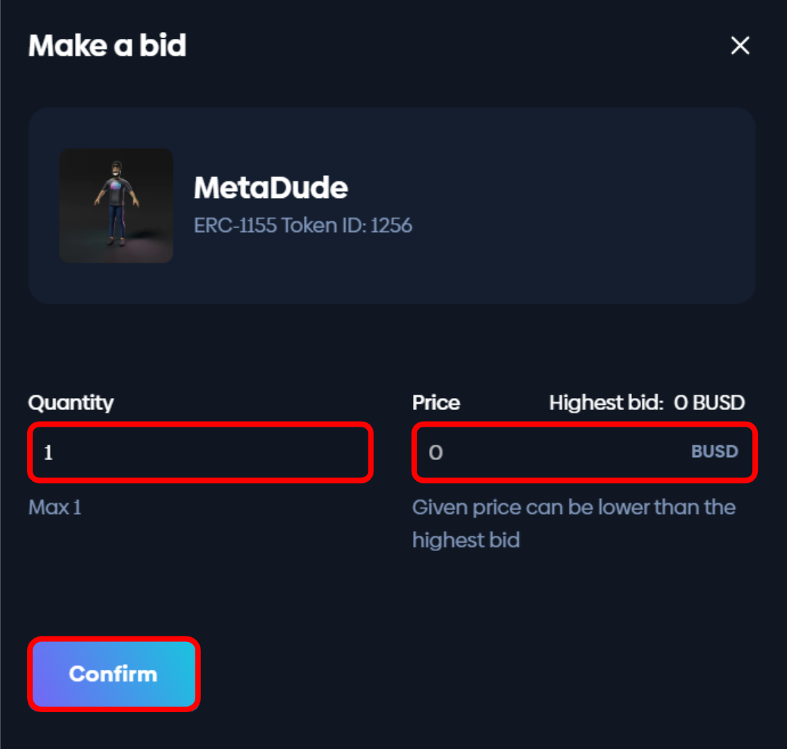 Enter the amount of NFT tokens you would like to purchase in this Auction, price for your bid and click Confirm.