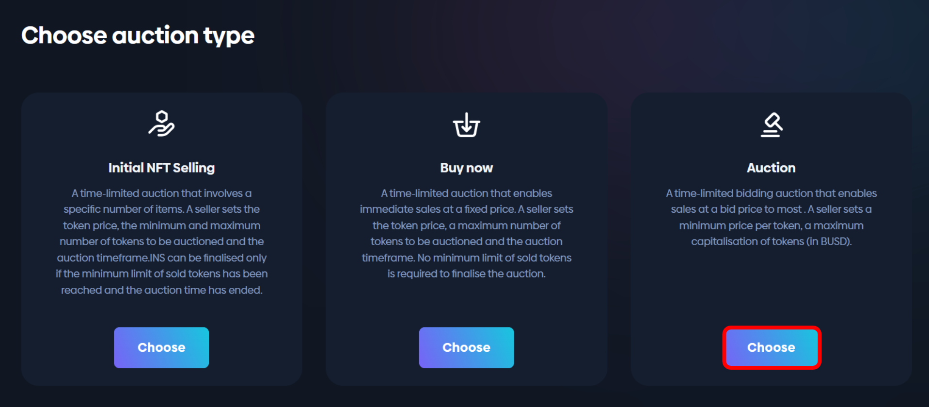 **Choose** the token for which you want to set the **Auction** and then click **Sell**