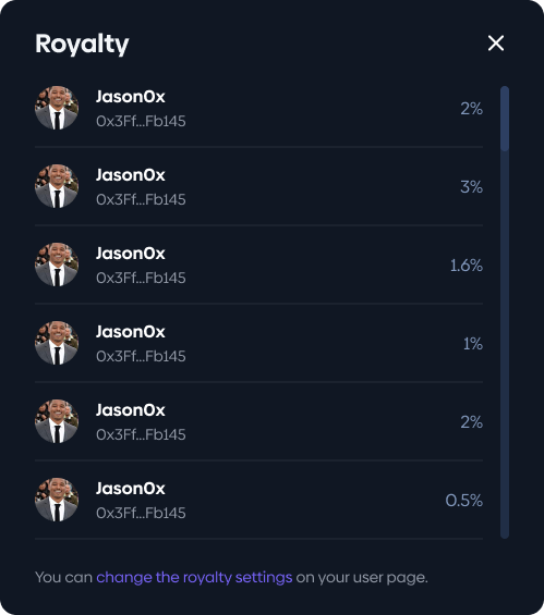 <figure><img src="https://2351247042-files.gitbook.io/~/files/v0/b/gitbook-x-prod.appspot.com/o/spaces%2F9QQIPimQeOGE3C1HbWxf%2Fuploads%2FkhQgvAOt8aby0meKdXk0%2FRoyalty%20popup.png?alt=media&#x26;token=3a632cd7-c8c9-41fb-be09-af2d655a0351" alt=""><figcaption></figcaption></figure>