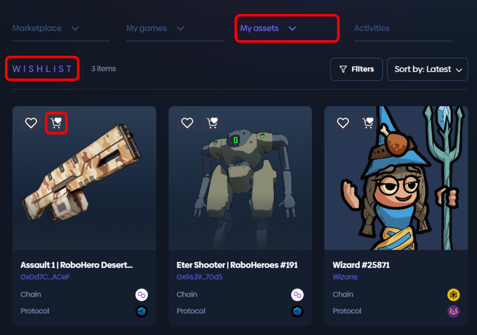 In the Wishlist tab, you will find assets that you have added to your wishlist. You can track these assets and stay up to date with their availability, updates, or promotions. By adding assets to your wishlist, you can easily keep tabs on your favorite assets and receive notifications when they become available for purchase or have any interesting offers.