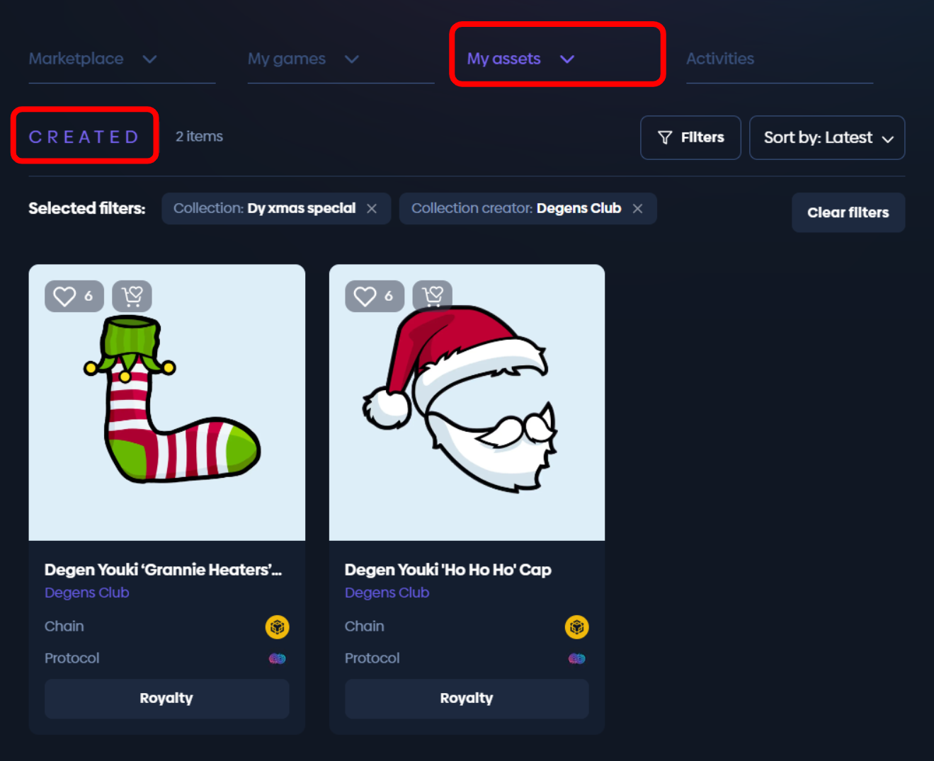 My assets tab on the market displays a comprehensive view of all your assets. Here, you can easily find collected assets, created assets, favorited assets and those added to your Wishlist.&#x20;