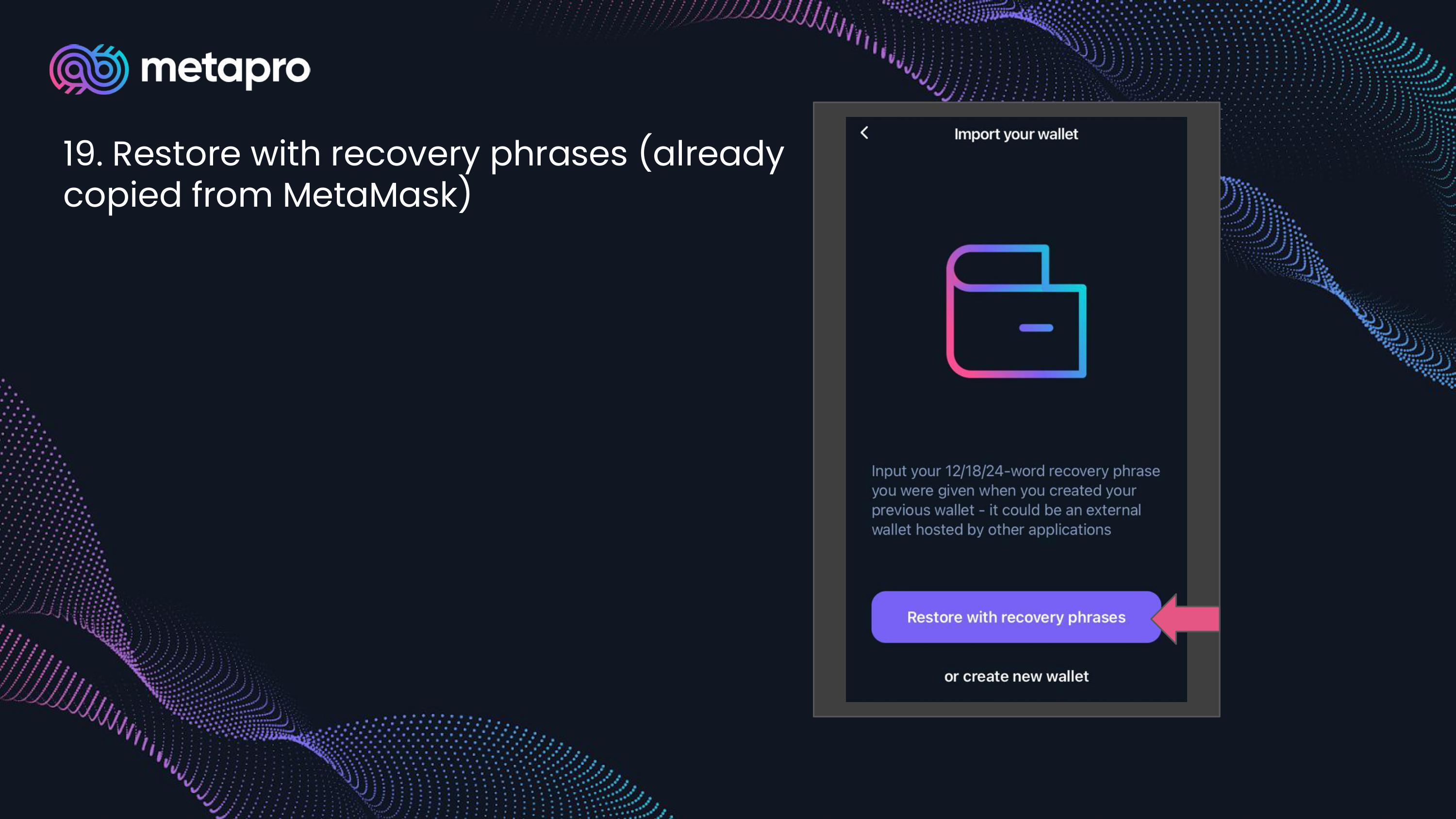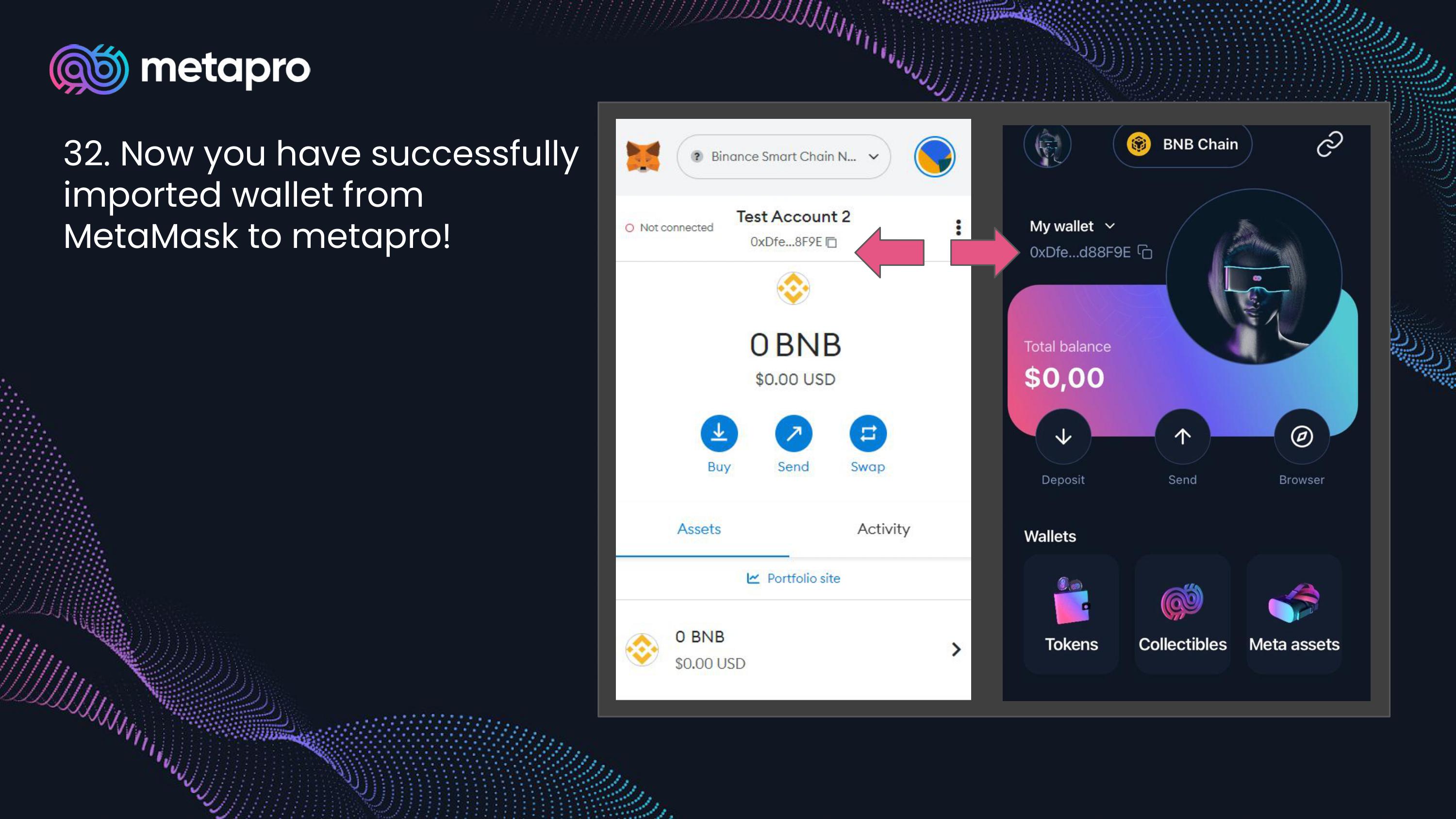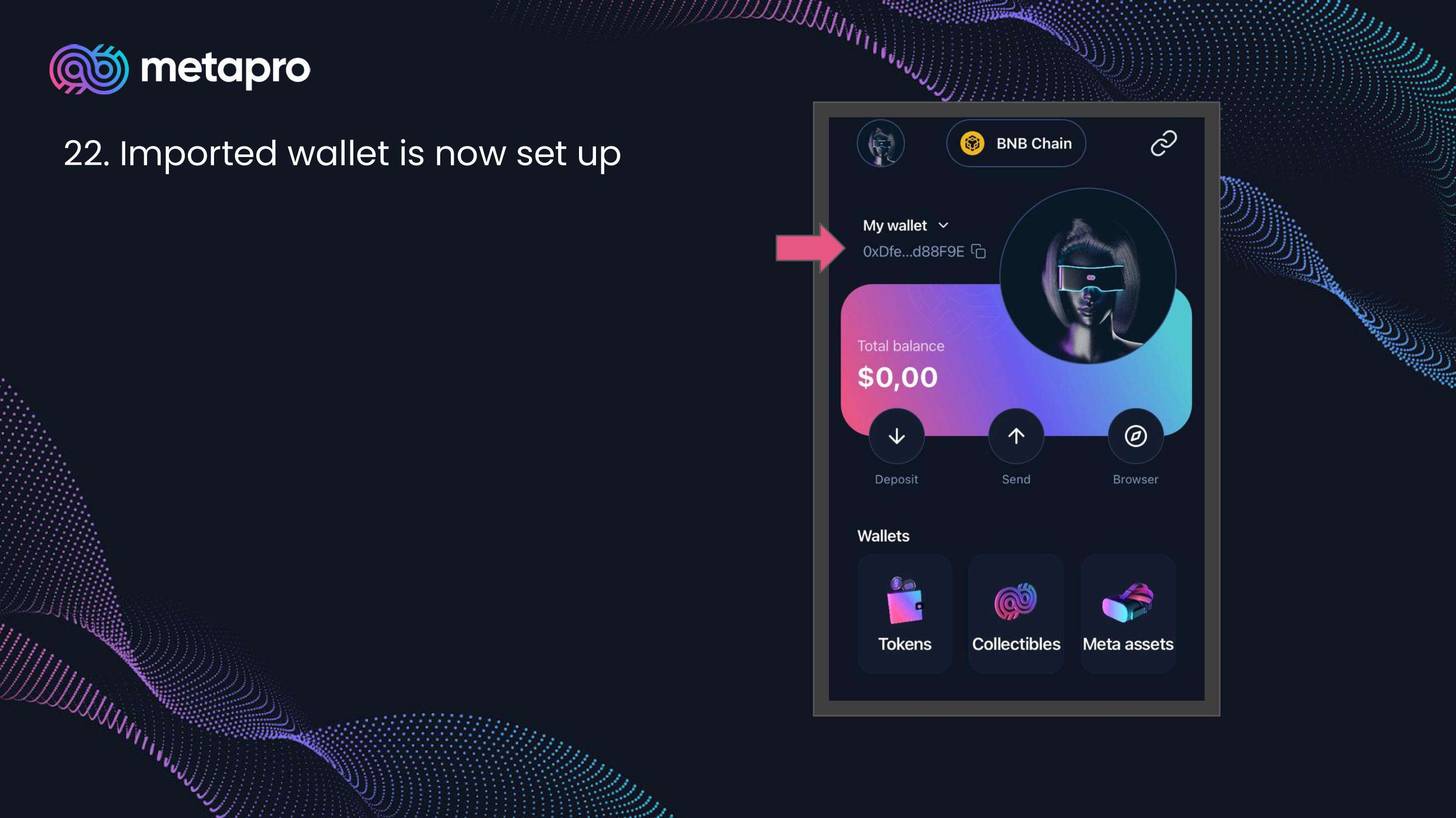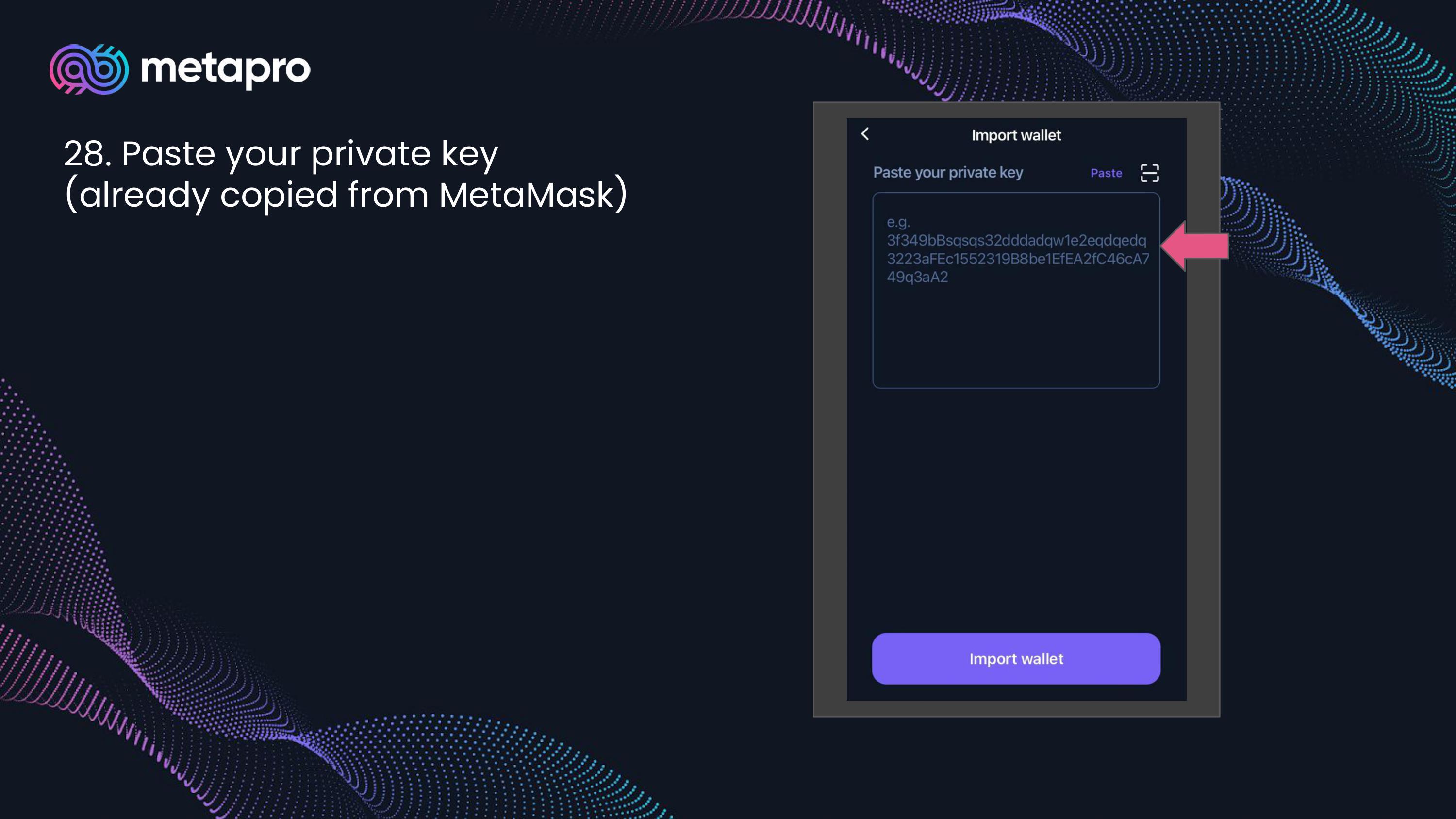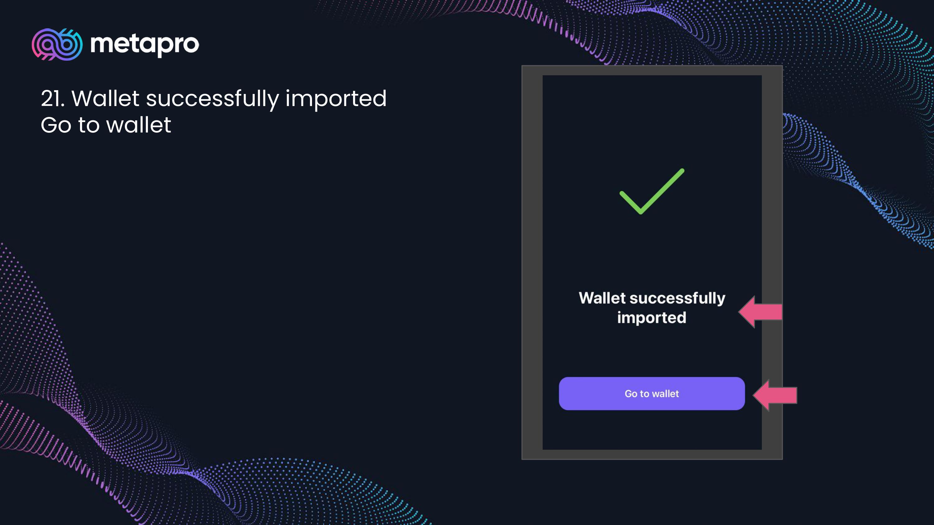 Keep in mind that you should only import a wallet if you are the owner of the private key and you have access to the associated password or phrase. Importing a wallet allows you to access and manage the assets associated with that wallet using metapro.